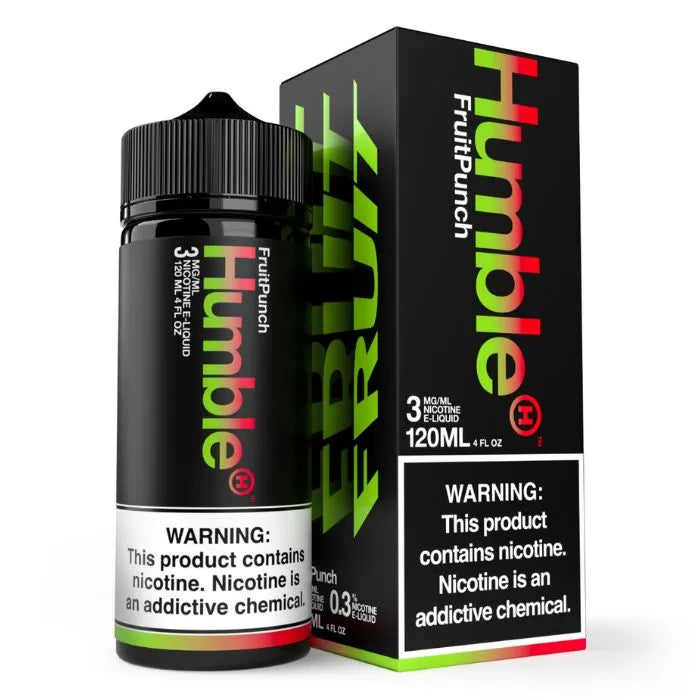 Savor Humble Fruit Punch E-Juice: A tropical blend of Hawaiian fruits and chewy goodness. Available in 3mg and 6mg nicotine, 70/30 VG/PG, in a convenient 120ml bottle.